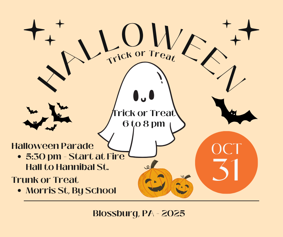 Blossburg Borough Trict or Treat Hours: 6:00pm to 8:00 pm – all around town