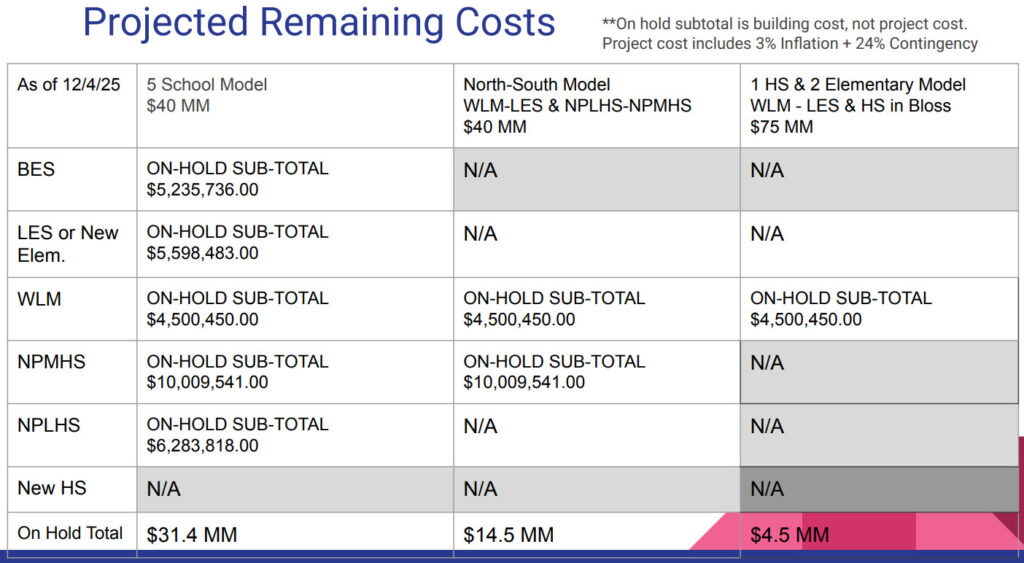 11/10/2025 Board Meeting – Voted to update the Operational Cost Savings for this option for comparison to other options. It was identified during this meeting that the original PFM costing worksheet for the consolidated scenario did not include all of the Estimated Operational Cost Savings. The $1,300,000 figure cited in the material was ONLY the cost savings for the High School consolidation and did not include the cost savings from combining BES and LES schools. Updated operational cost savings would be expected to be around $2,500,000 to $3,000,000 per year.