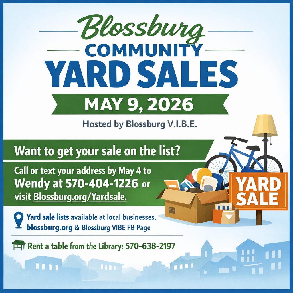 Stop by Blossburg for the Community Wide Yard Sales on May 9, 2026 starting at 8am. We’re sure you’ll find the treasure you’ve been looking for!