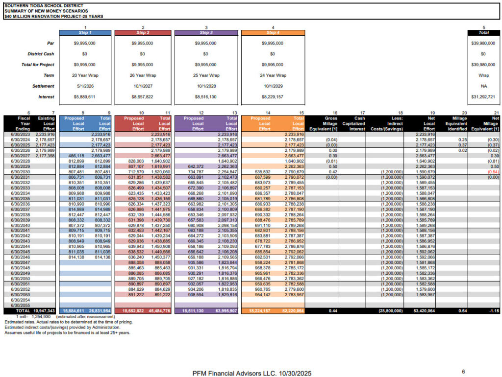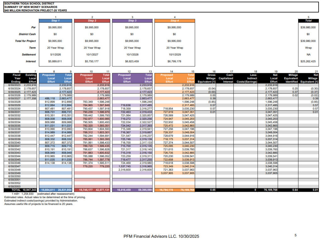 Presented at 11/3/2025 work session by PFM – All 5 School Improvements – perform roughly 50% to 60% of work categories noted in Alloy 5 presentations. Limited tax impact, but reduces or eliminates borrowing capacity beyond this for about 15 years while debt is serviced. 20 year rolling debt service.
