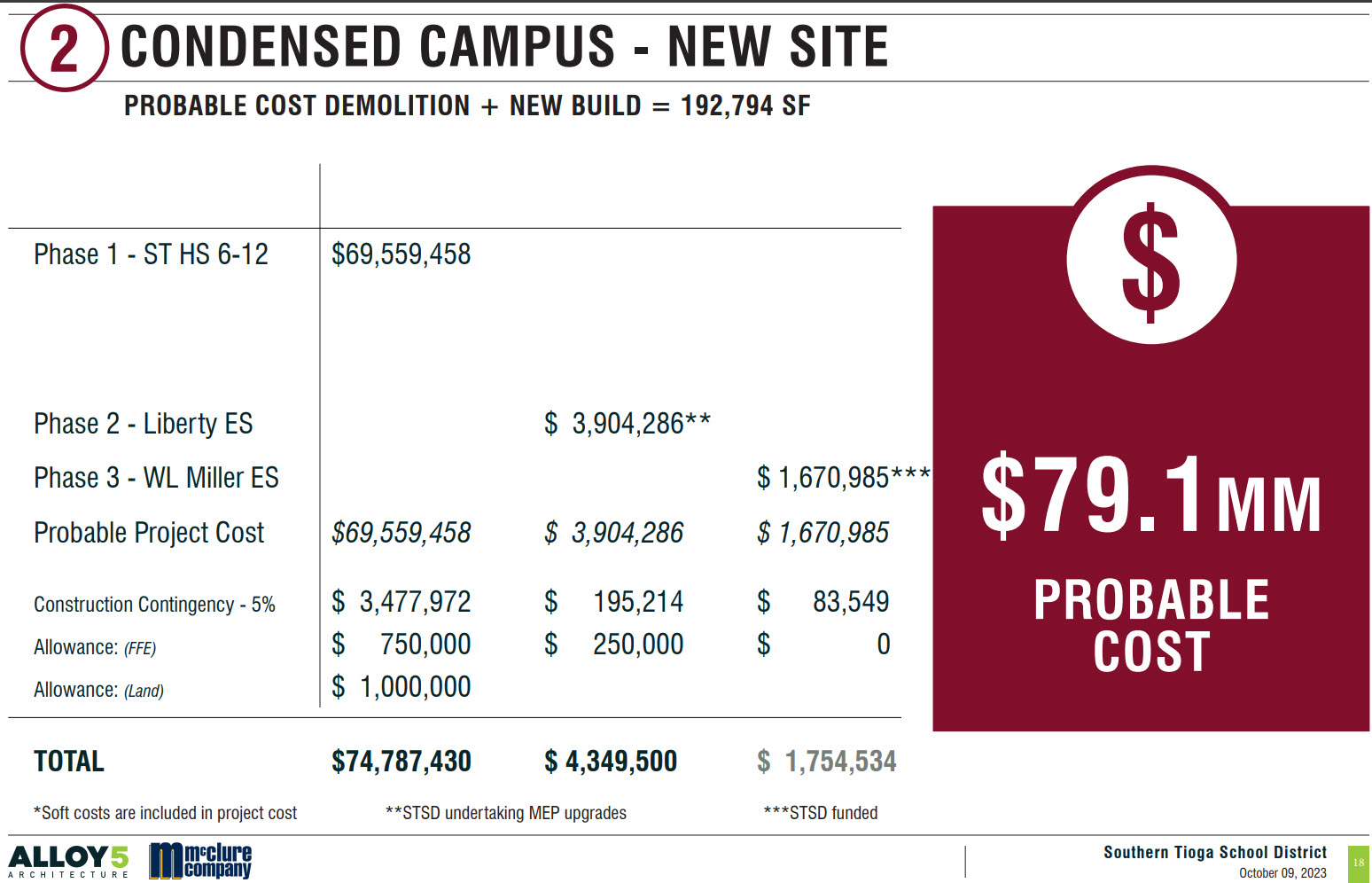Presented at 11/3/2025 work session by PFM – All 5 School Improvements – perform roughly 50% to 60% of work categories noted in Alloy 5 presentations. Limited tax impact, but reduces or eliminates borrowing capacity beyond this for about 15 years while debt is serviced. 20 year rolling debt service.
