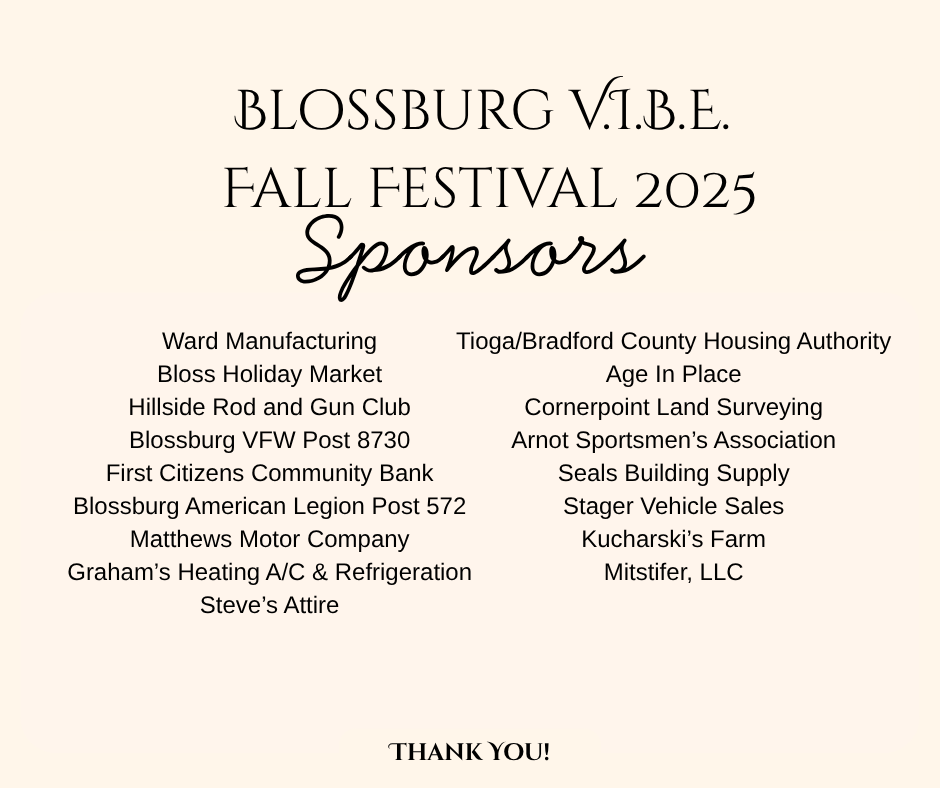 Thank you to all of the Blossburg V.I.B.E. Fall Festival Sponsors for helping to make this event successful!